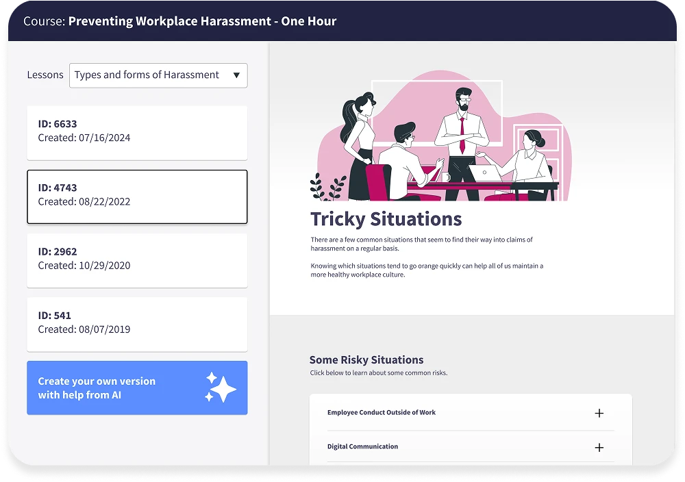 AI-powered authoring grounded in 20+ years of expert-developed compliance content. You get the speed of AI without the hallucination risk your legal team can’t afford.