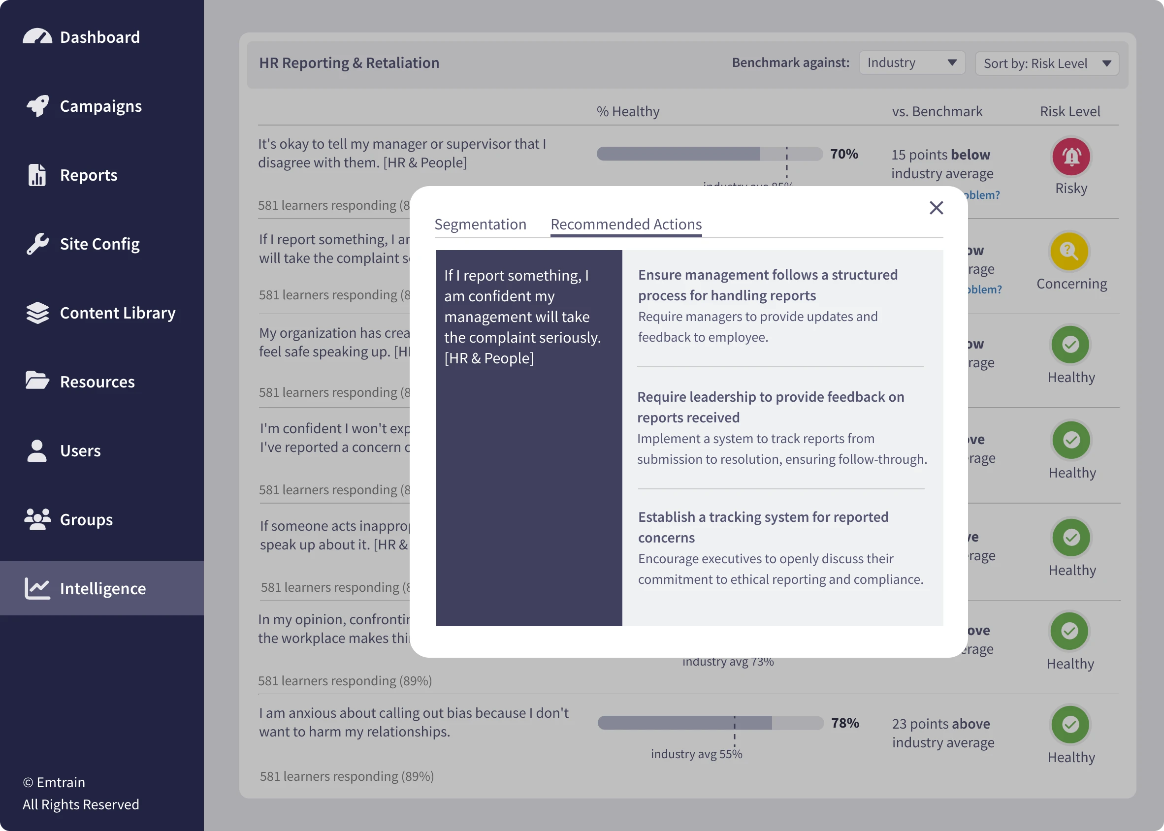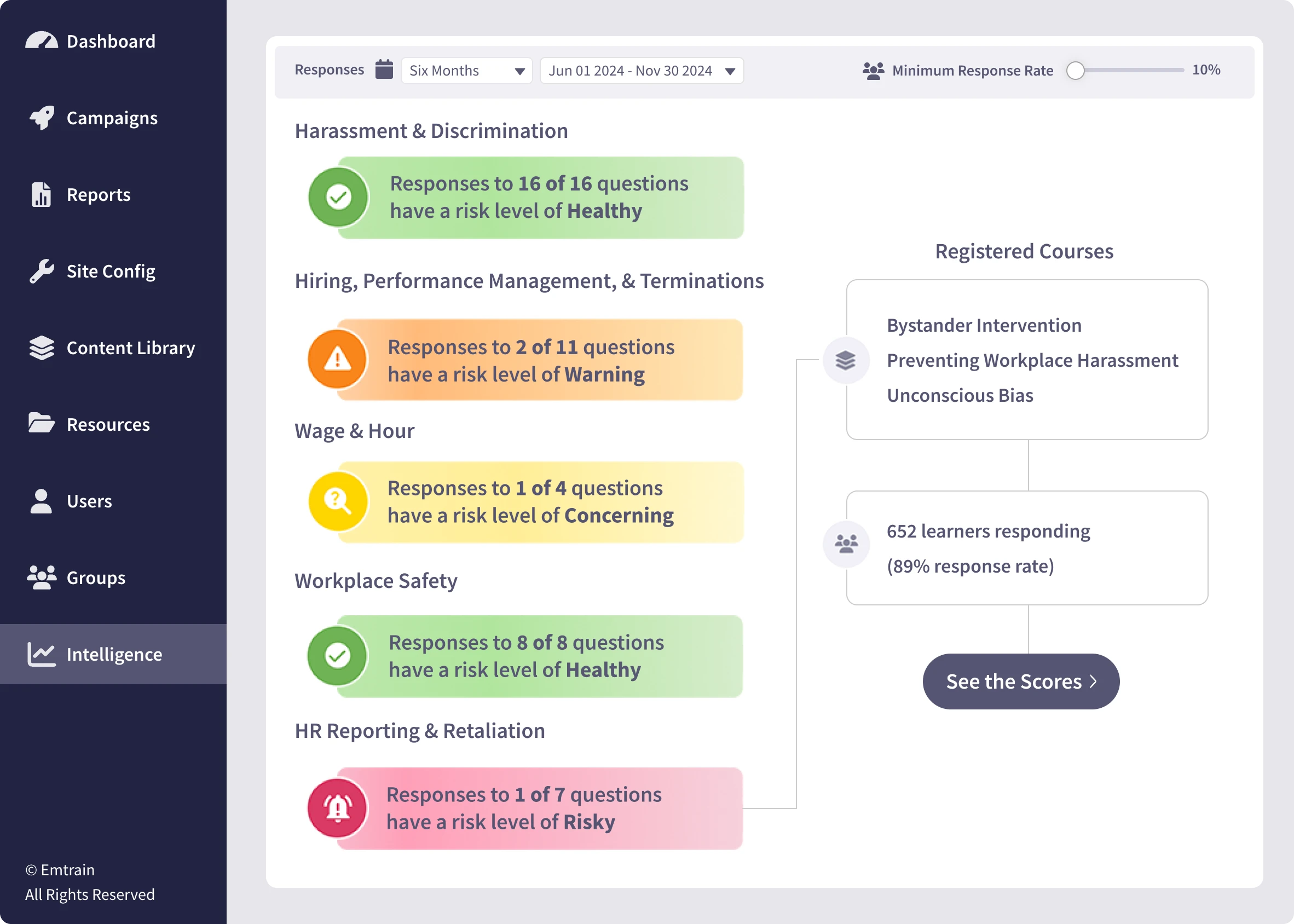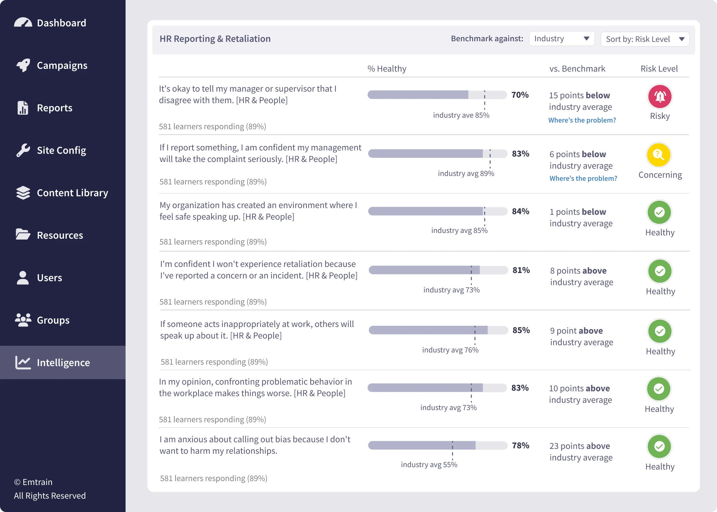 Emtrain aggregates question-level data from training to uncover warning indicators tied to reporting & retaliation risk.