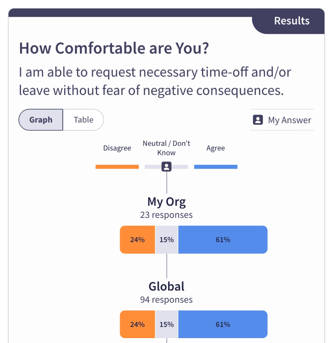 • Employee sentiment pulsing questions that provide leaders with insights into their workforce's core cultural competencies