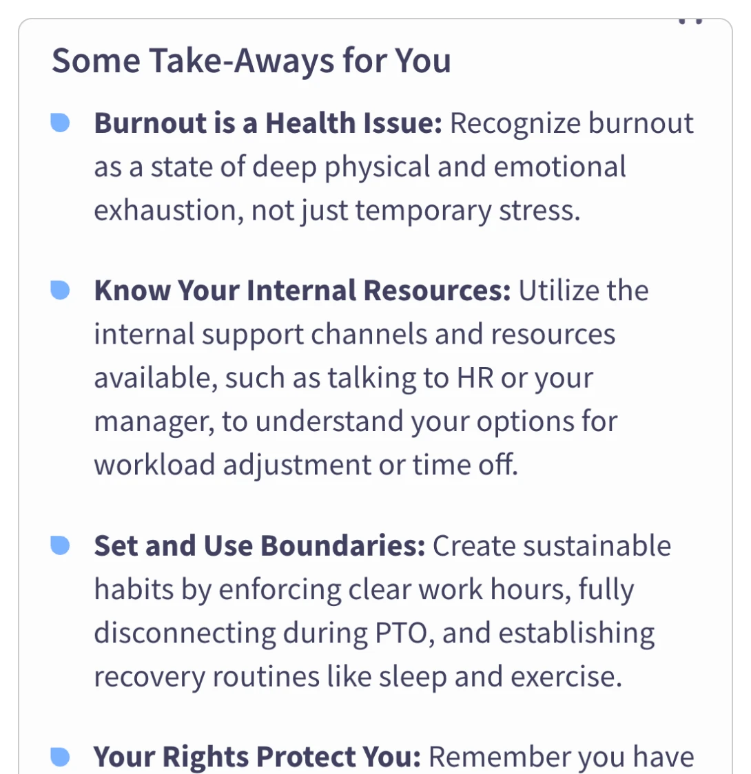 Help employees understand what burnout looks like, why it happens, and why early intervention is essential for long-term performance and health. Bring clarity to workplace expectations around recovery, PTO, and workload conversations.
