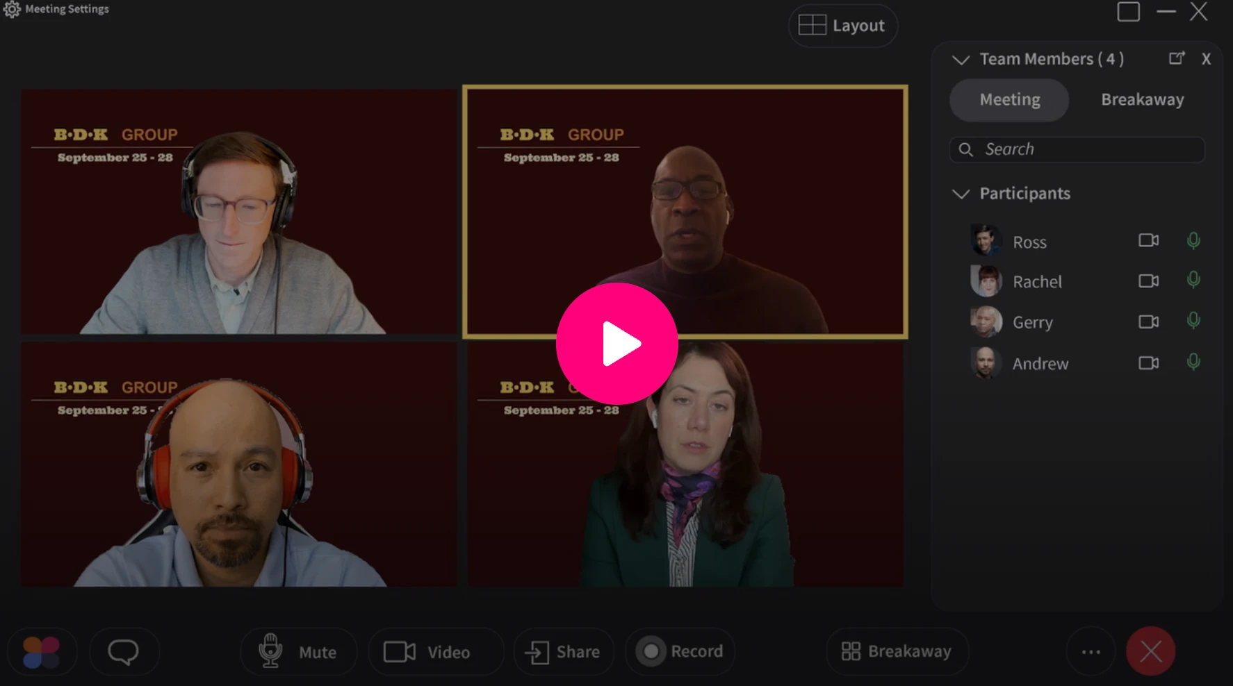The scene opens on a video conference call with a diverse four-person team preparing for an upcoming event. Ross, the manager, is leading the meeting. Rachel, Gerry, and Andrew are all participating, each joining with the same virtual background displaying the event branding.