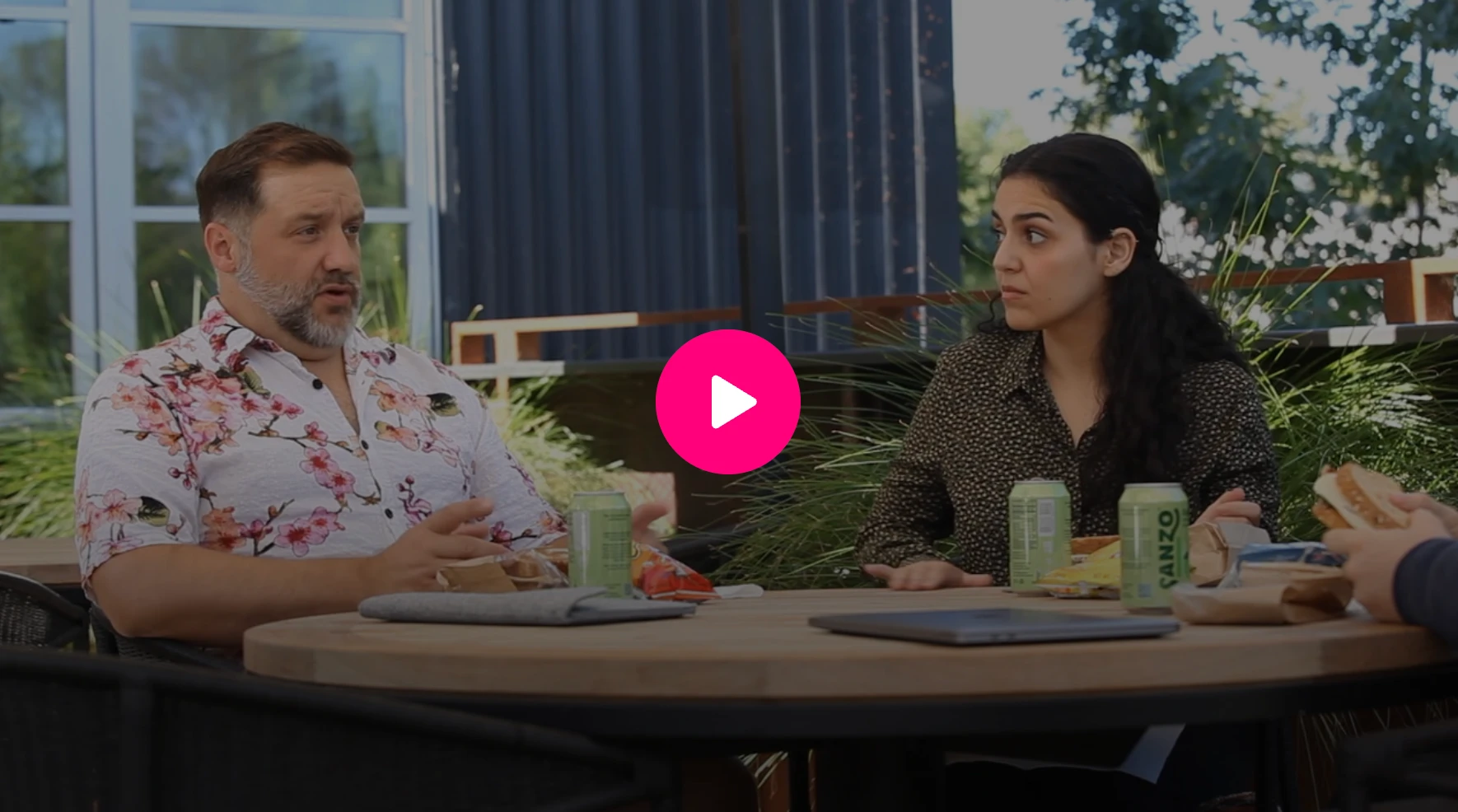 The scene opens with three coworkers—Thomas, Adam, and Briana—sitting together at an outdoor café table during lunch. As they prepare to eat, Thomas quietly bows his head, clasps his hands, and says a brief prayer before his meal. He does this silently and does not ask anyone else to participate.